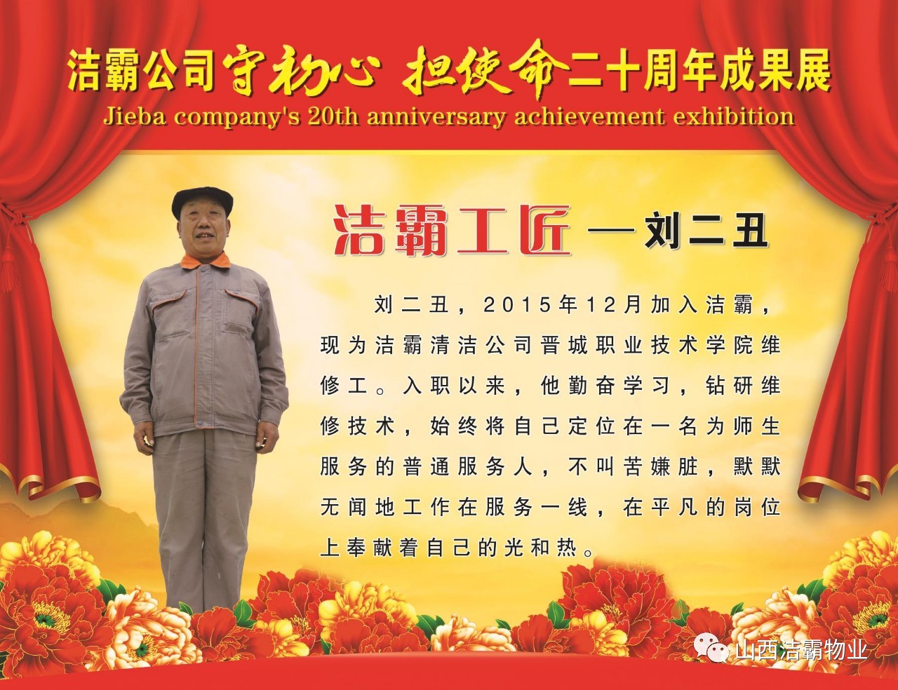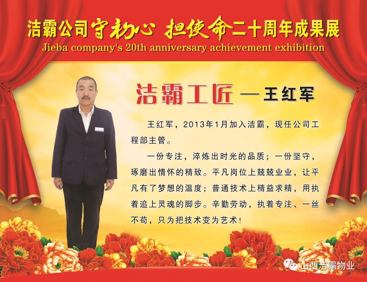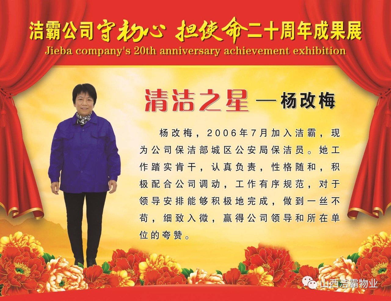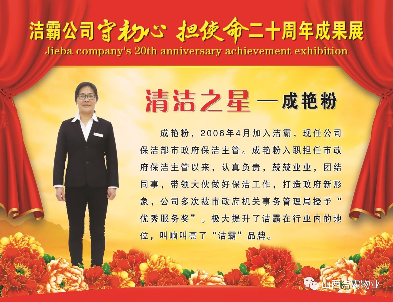本次晚會以“潔霸二十華彰,感恩共創(chuàng)輝煌”為主題,此次慶典的核心思想是“感恩”,主要角色是潔霸的創(chuàng)業(yè)者。為此,公司對入職潔霸的創(chuàng)業(yè)功勛和一線員工進行了表彰獎勵。本次晚會共設(shè)8個獎項,包括“潔霸先鋒”“奉獻之星”“管理之星”“潔霸管家”“潔霸工匠”“清潔之星”“潔霸衛(wèi)士”“園藝之星”等。他們是:李山虎、張永智、史志霞、陳福林、王紅軍、余艷青、劉二丑、成艷粉、楊改梅、王書玲、張國榮、耿竹青、張粉霞、宋秋苗、陳先梅、張晉平、張偉山、趙瑞軍、王廣平、郭志云。晉城市原副市長成育廷、晉城市商務(wù)局原局長王新善、晉城市非公和社會組織工委書記郎軍芳、晉城市婦聯(lián)三級調(diào)研員李蓮菊、晉城市總工會商貿(mào)輕紡煙草服務(wù)業(yè)工會主席張玉濤、晉城市城區(qū)財政局局長翟明太等領(lǐng)導為他們頒獎。