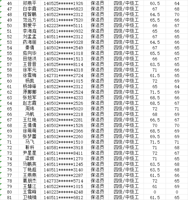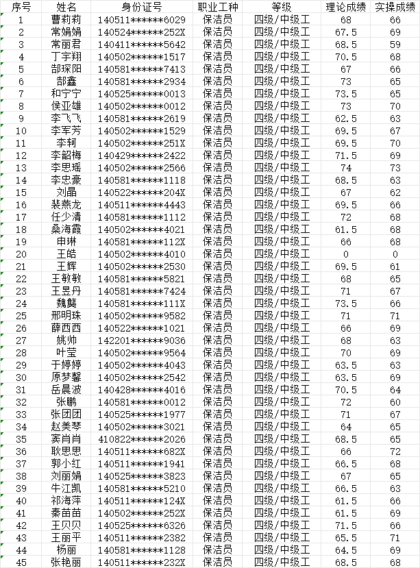 晉城市潔霸清潔服務(wù)股份有限公司職業(yè)技能等級認定中心現(xiàn)將2024年1月27日下午認定人員成績公示如下: