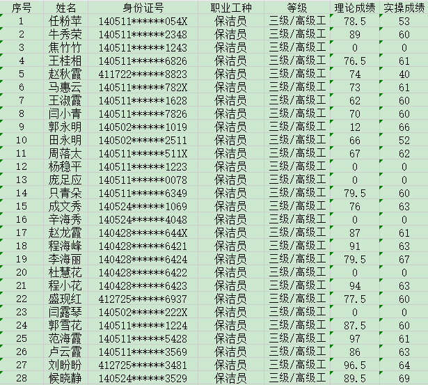 晉城市潔霸清潔服務(wù)股份有限公司職業(yè)技能等級認定中心現(xiàn)將2024年5月19日認定人員成績公示如下:
