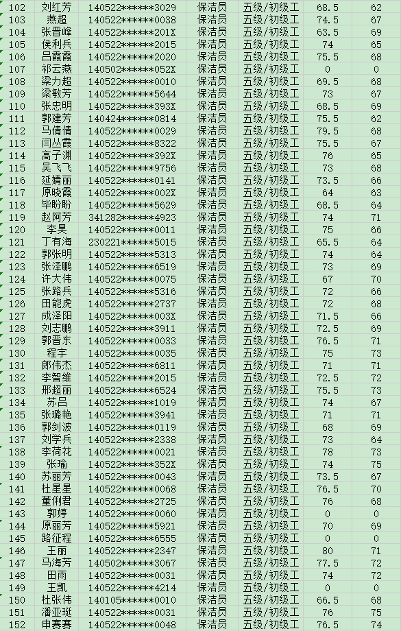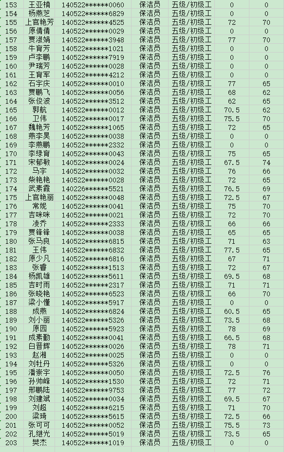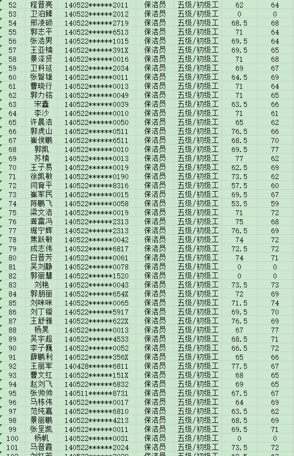 晉城市潔霸清潔服務(wù)股份有限公司職業(yè)技能等級認定中心2024年8月17日第29批保潔員初級認定人員成績公示